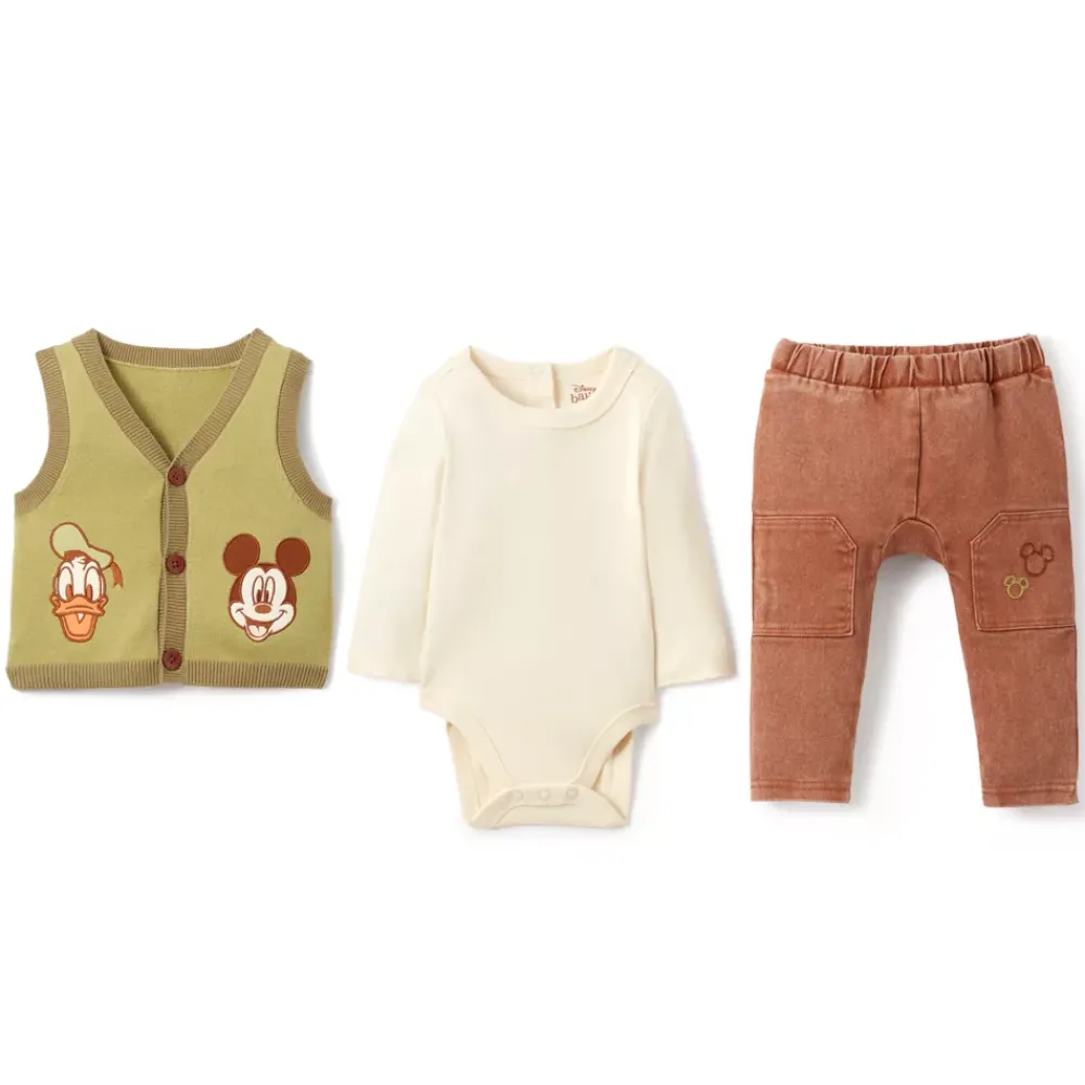 Les meilleurs amis Mickey et Donald font équipe sur cet ensemble trois pièces super mignon pour bébé. Le duo est représenté sous forme d’appliqués brodés sur le devant du gilet en tricot avec bord-côte contrastant. Des têtes de Mickey sont brodées sur le bas à effet délavé, tandis qu’un body à manches longues de couleur crème complète l’ensemble.
