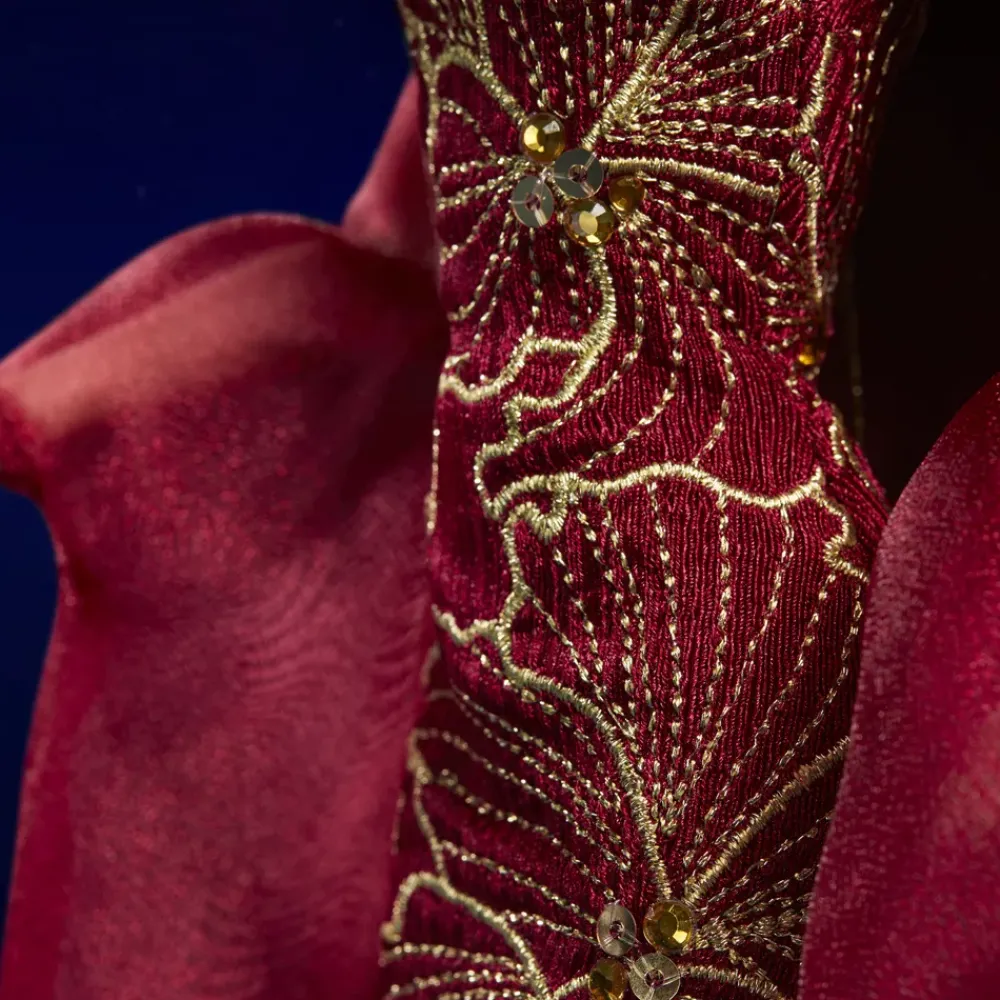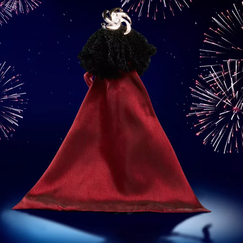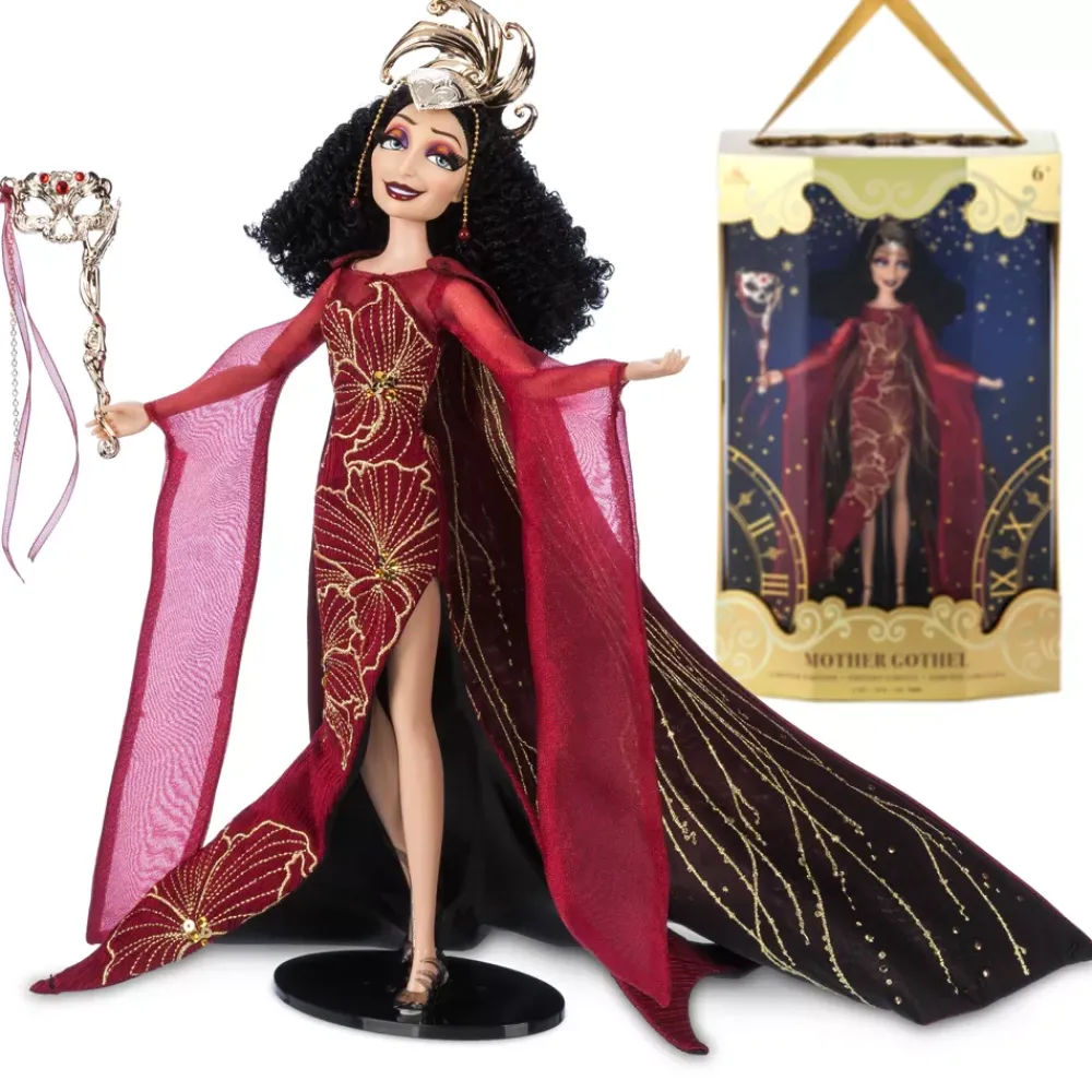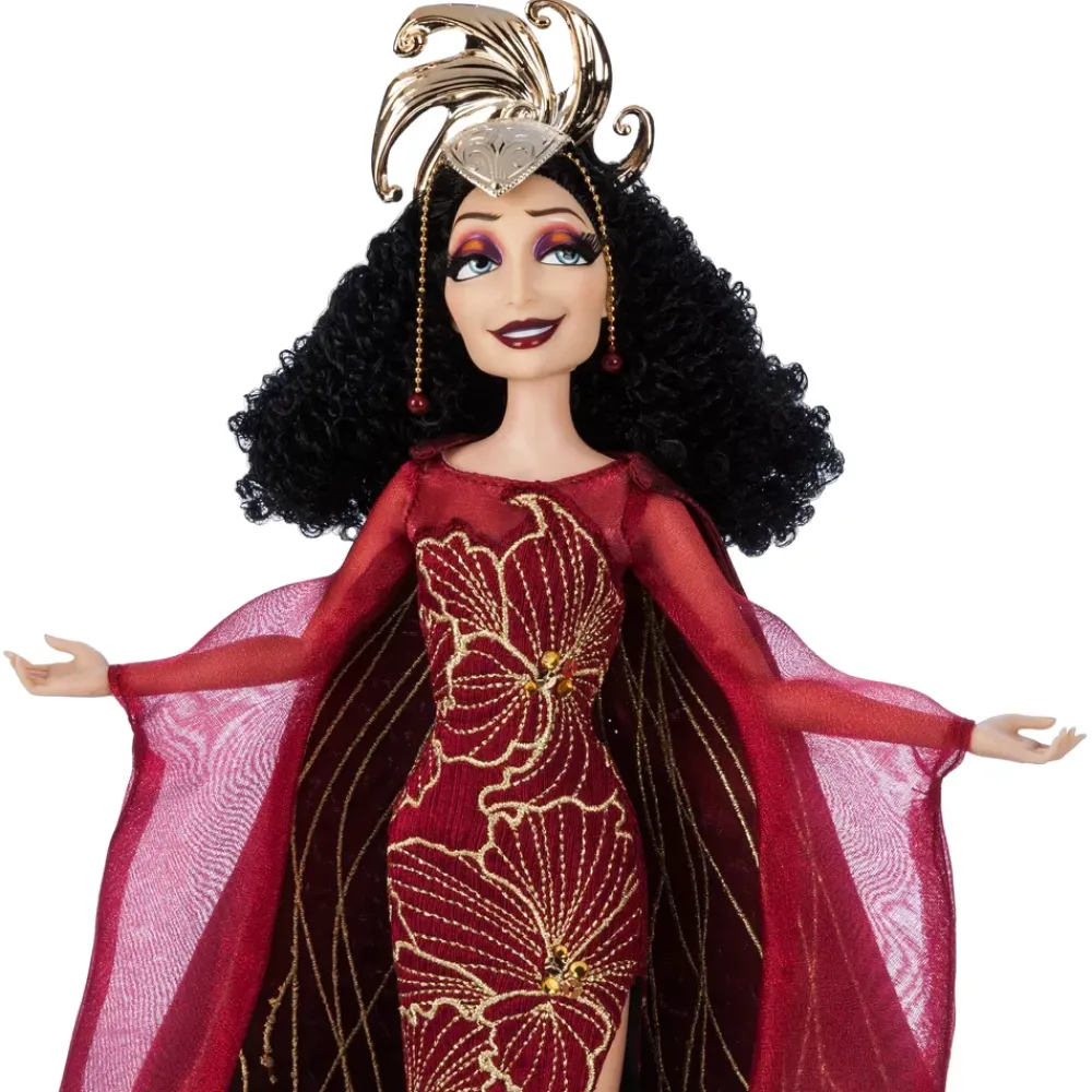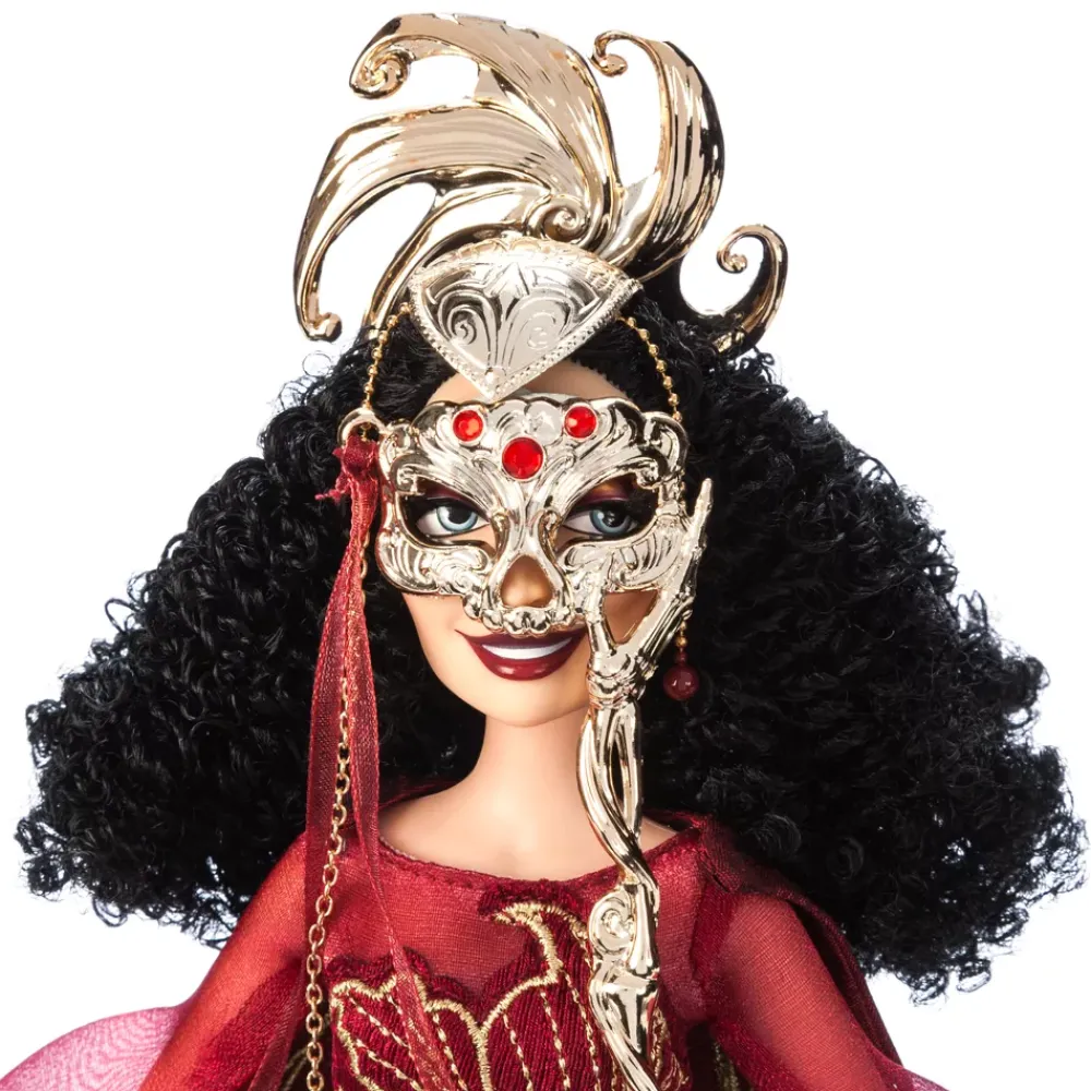 Contrairement à son habitude, Mère Gothel ne passe pas inaperçue pour aller au bal ! La geôlière de Raiponce fait une sortie remarquée avec cette longue robe fendue décorée de broderies dorées, de sequins et de longues manches. Sa tenue est complétée par son masque à tige doré et sa coiffe bordée d’une chaîne à maillons. Ne passez pas à côté de cette ravissante poupée pour votre collection !