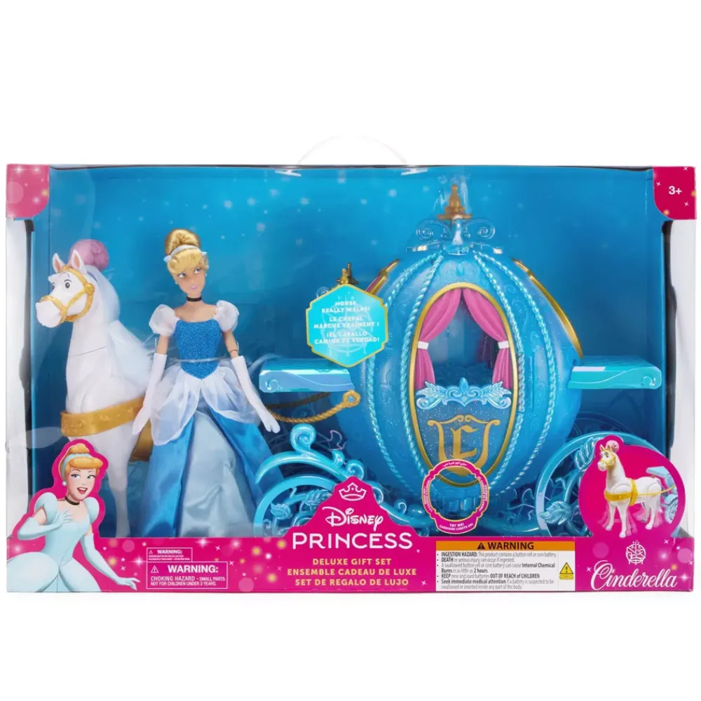 Bibbidi-Bobbidi-Boo ! D’un simple coup de baguette magique, Cendrillon est prête à se rendre au bal. Ce coffret deluxe comprend une poupée Cendrillon classique, un carrosse citrouille lumineux aux bordures dorées, un beau cheval qui avance vraiment et une fabuleuse robe de bal scintillante.