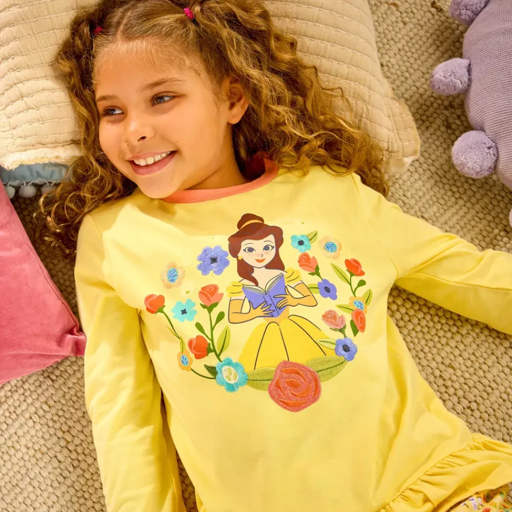 Inspirez de doux rêves et des moments féériques grâce à ce pyjama Belle magnifique, parfait pour les bouts de chou qui aiment la magie des contes de fées. Le haut représente Belle dans sa célèbre robe de bal jaune, lisant paisiblement un livre et encadrée d’une délicate bordure florale. Voilà un doux clin d’oeil à son amour de l’apprentissage et à son élégance intemporelle ! Un ourlet à volants tout doux ajoute une charmante finition digne d’une princesse, tandis que le bas à imprimé floral assorti complète le look avec confort et style. Fabriqué dans un tissu doux et respirant, cet ensemble est idéal pour les nuits douillettes, les moments de lecture ou les week-ends de détente.