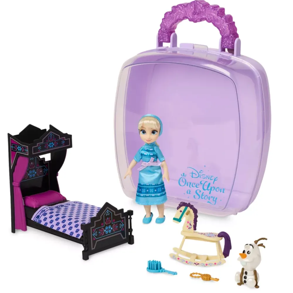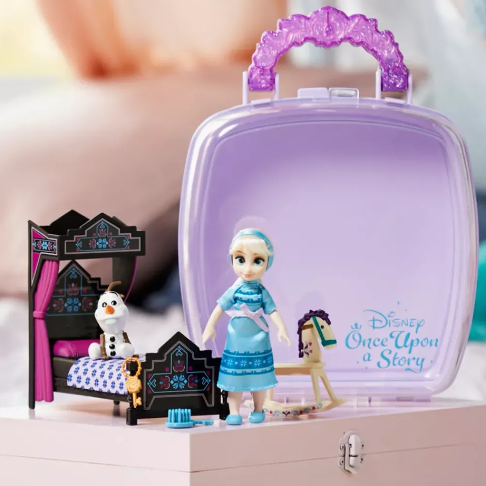 La collection Once Upon a Story rend hommage au pouvoir de l’imagination et de la créativité à travers les personnages emblématiques de Disney. Des centaines d’histoires féériques n’attendent qu’à être créées ! Cette poupée articulée de 12,5 centimètres environ représente Elsa enfant, alors qu’elle rêvait déjà de vivre dans des contrées couvertes de neige. Elle est fournie dans une mallette avec fenêtre transparente, poignée pailletée et fermeture à bouton-pression, et est accompagnée d’une multitude d’accessoires, d’une figurine Olaf, d’un lit et d’un cheval à bascule.