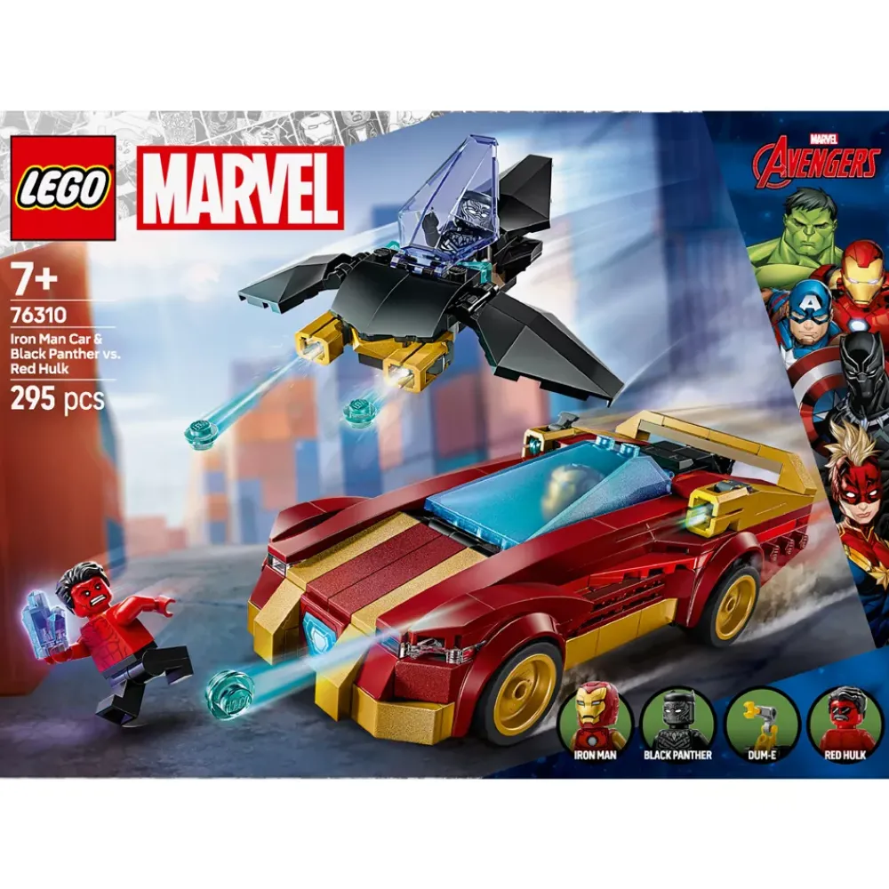La voiture d’Iron Man et Black Panther contre Hulk rouge LEGO (76310) est un jouet d’exception pour les garçons et les filles dès 7 ans passionnés de véhicules, de super-héros et de combats entre le Bien et le Mal. C’est un beau cadeau à offrir aux jeunes super-héros, et notamment aux fans de Marvel et aux enfants qui aiment les jouets à manipuler.Ce set Iron Man inclut les minifigurines d’Iron Man, de Black Panther et de Hulk rouge, ainsi que la figurine LEGO de Dum-E (le robot assistant d’Iron Man) munie d’un extincteur. L’élégante voiture de sport d’Iron Man dispose de 2 lance-tenons, d’un cockpit ouvrant et de place pour Dum-E et l’extincteur. L’avion de Black Panther possède 2 lance-tenons, des ailes réglables, un cockpit ouvrant et un tableau de bord. Les enfants peuvent imaginer que Hulk rouge vole le précieux cristal de vibranium. Pour s’amuser davantage, les constructeurs peuvent zoomer, faire pivoter les modèles en 3D et suivre leur progression avec l’appli LEGO Builder.
