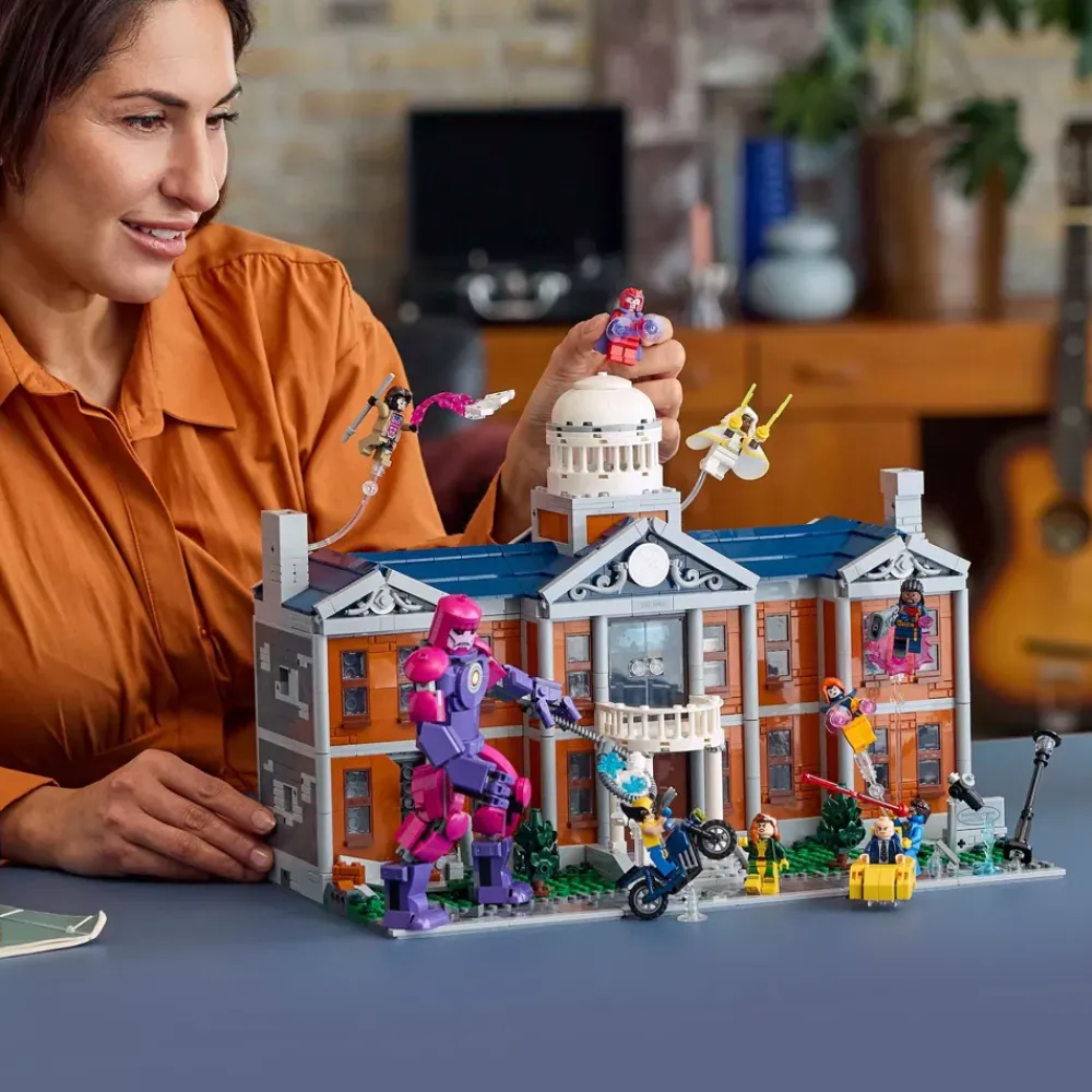 - Accessoires réalistes – Les éléments reconnaissables de l’institut Xavier incluent Cerebro, des fusées, des tronçonneuses, un laser et le dispositif de contention de minifigurine de la Sentinelle