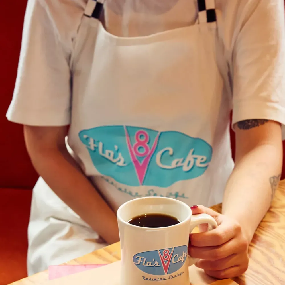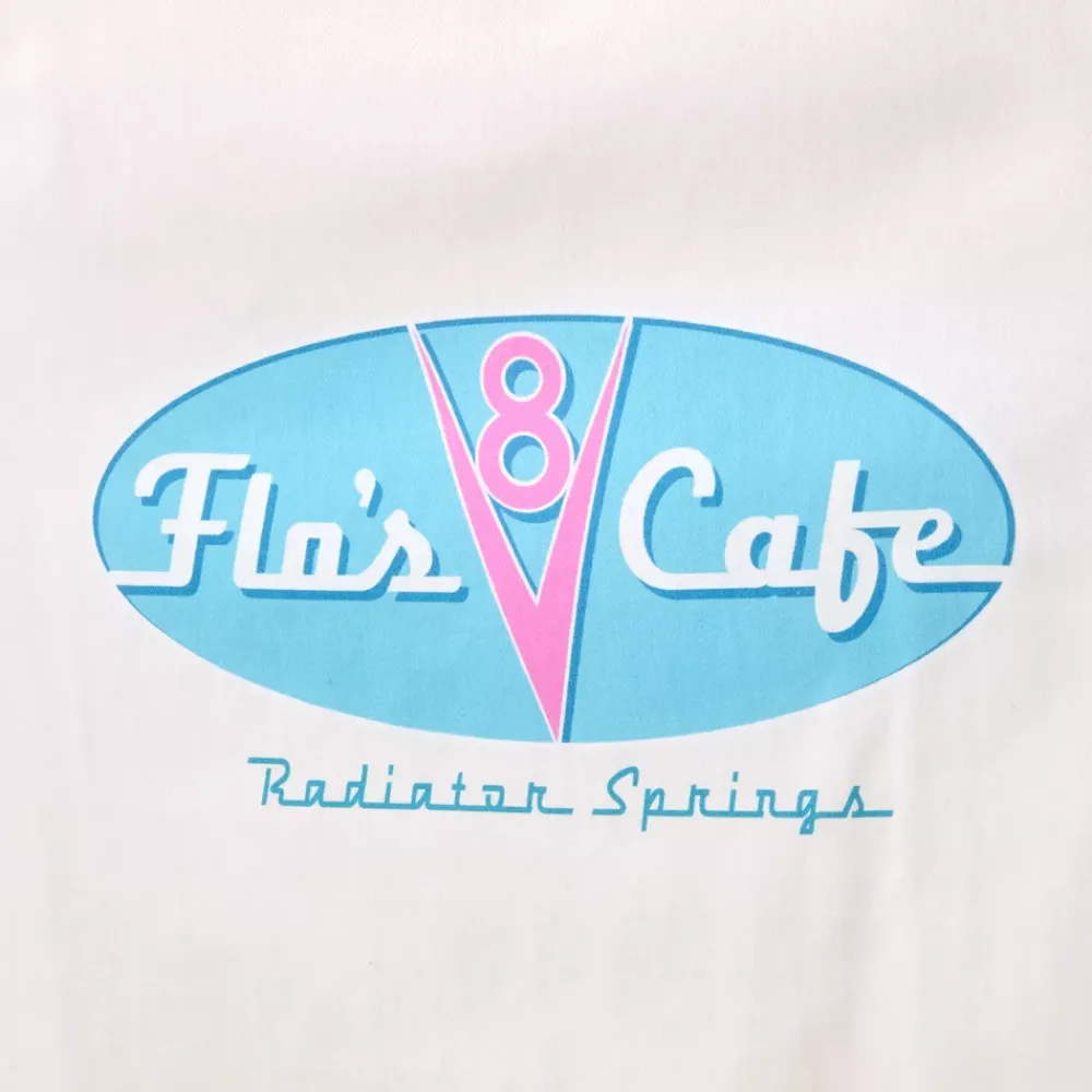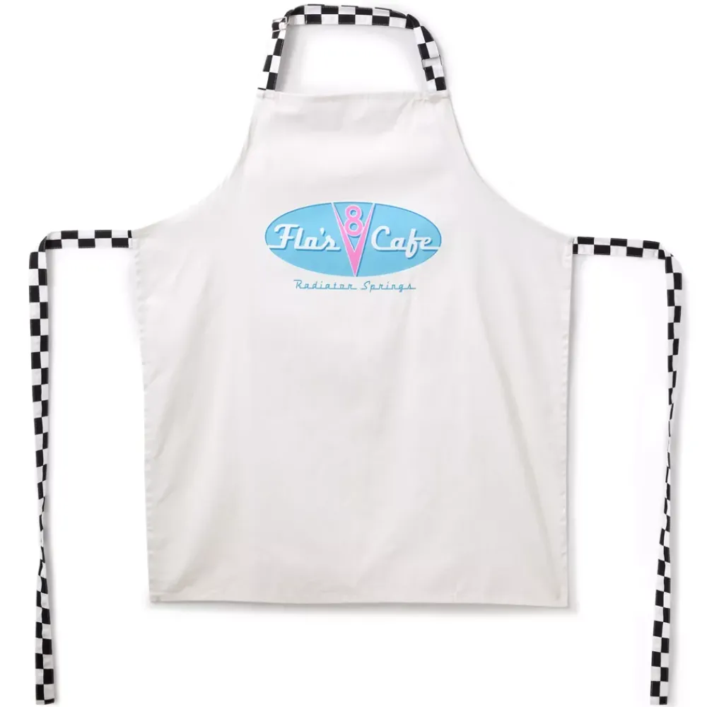 Mettez les gaz en cuisine avec ce tablier Café V8 de Flo ! Décoré de bordures au motif damier et du logo V8 emblématique, il vous rappellera le charme de Radiator Springs et de son diner incontournable.