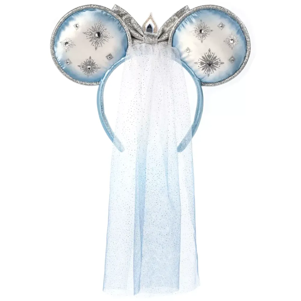 Empruntez un peu de son style à la Reine des Neiges ! Ce serre-tête comprend des oreilles en satin serties de strass, un voile scintillant et un nœud à paillettes, sans oublier un camée effet diadème.