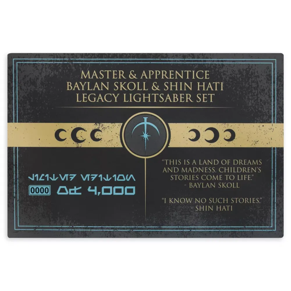 Cette édition spéciale présente les sabres laser de deux des personnages principaux de la série Star Wars: Ahsoka sur Disney+. Reproductions fidèles des gardes de Shin Hati et de Baylan Skoll, elles incluent des effets sonores et s’illuminent d’une couleur rouge-orange lorsque les deux lames de sabre laser incluses y sont attachées. Les deux gardes et les deux lames sont fournies dans une boîte de présentation doublée et décorée du symbole d’Ahsoka sur le devant.