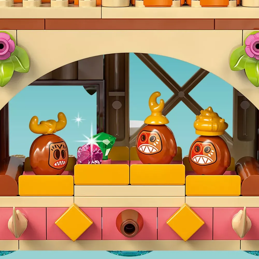 - Bateaux Vaiana à construire – Inclut un navire composé de 3 sections et d’une tyrolienne, un petit canoë à double coque avec espace de rangement, le coq Heihei, Vaiana, Maui, Kotu et 5 autres personnages LEGO ǀ Disney